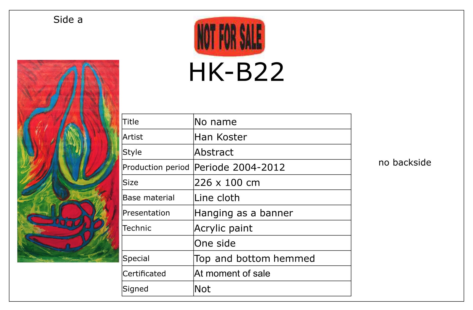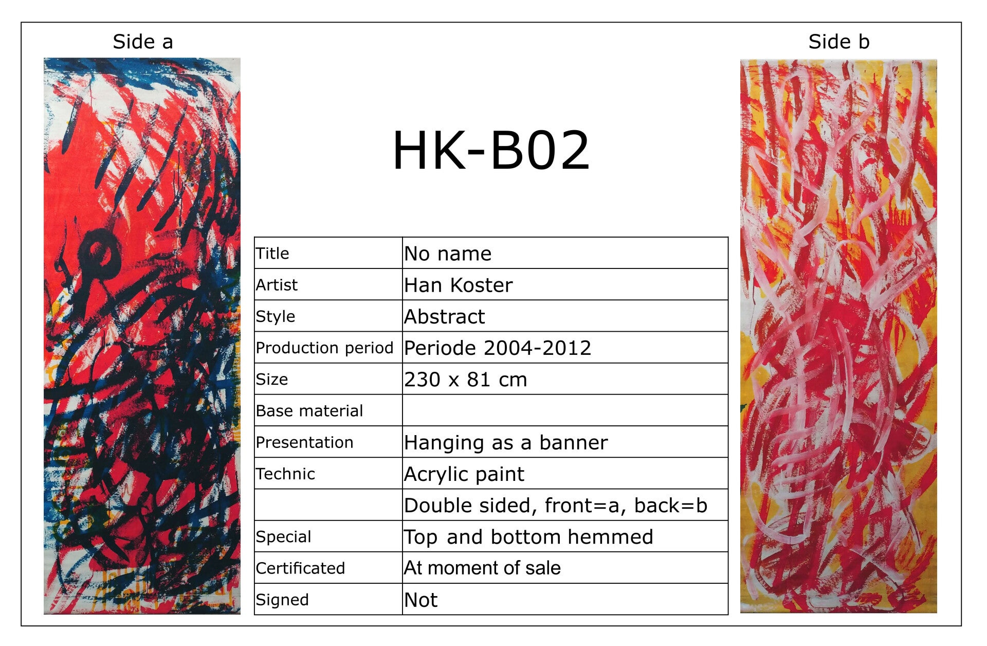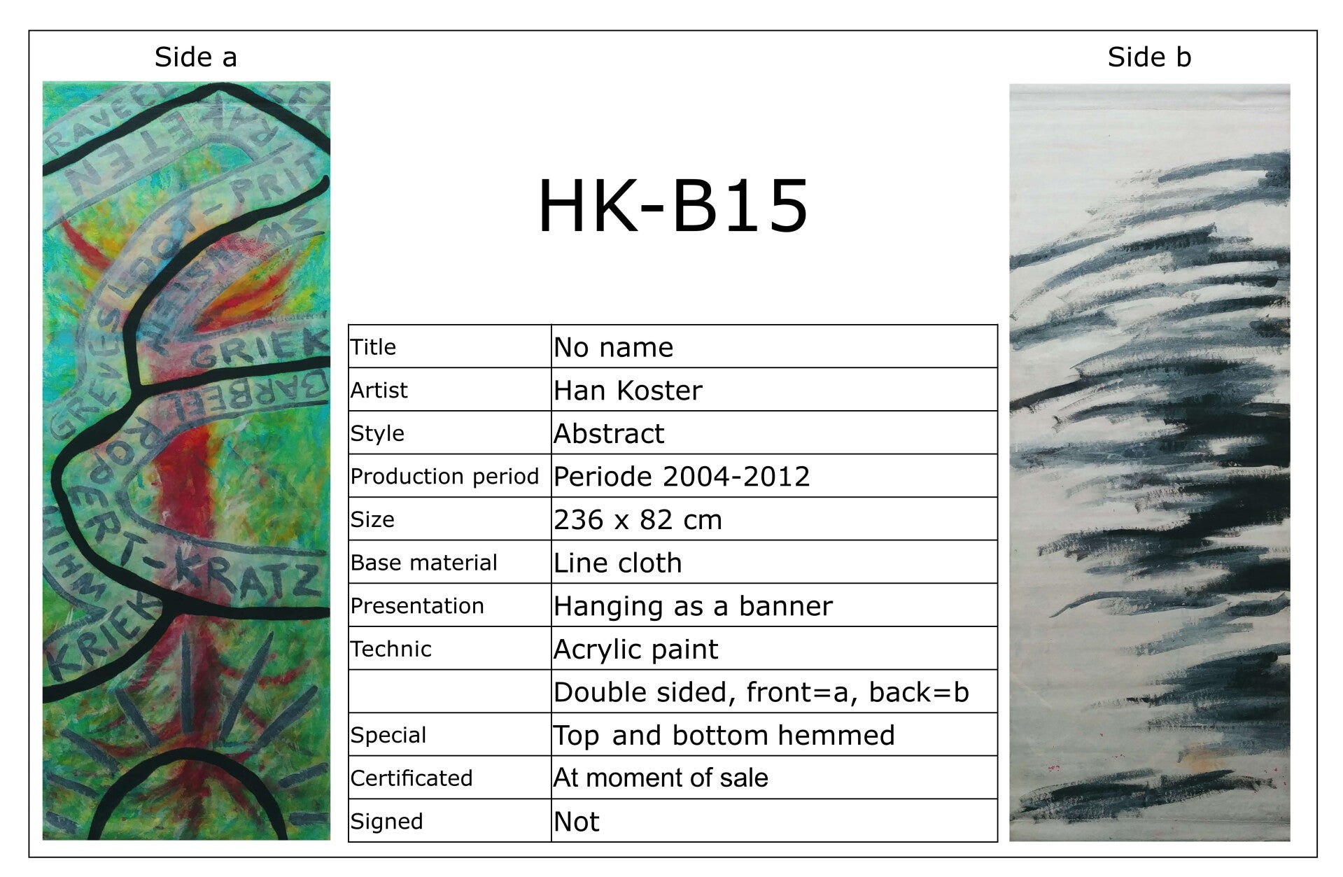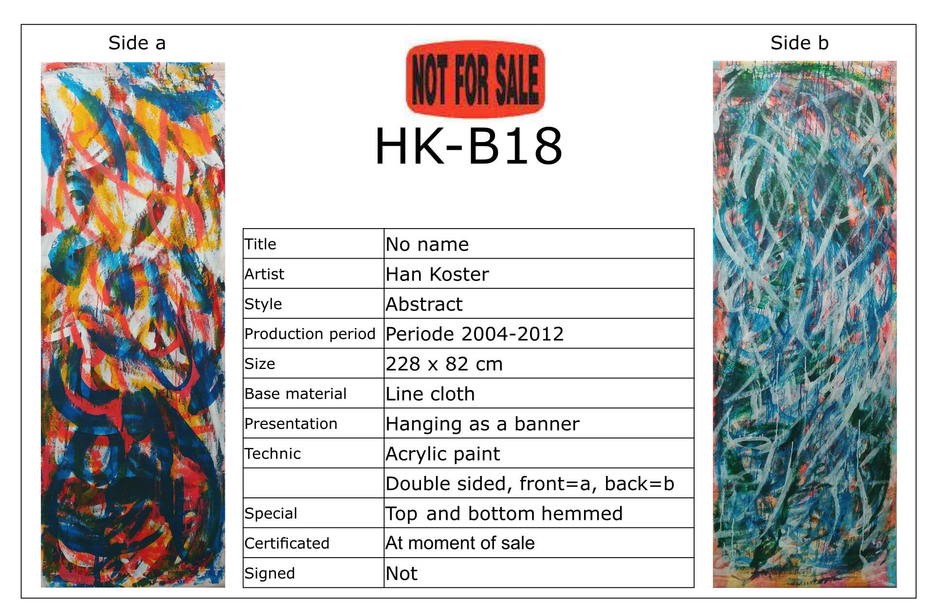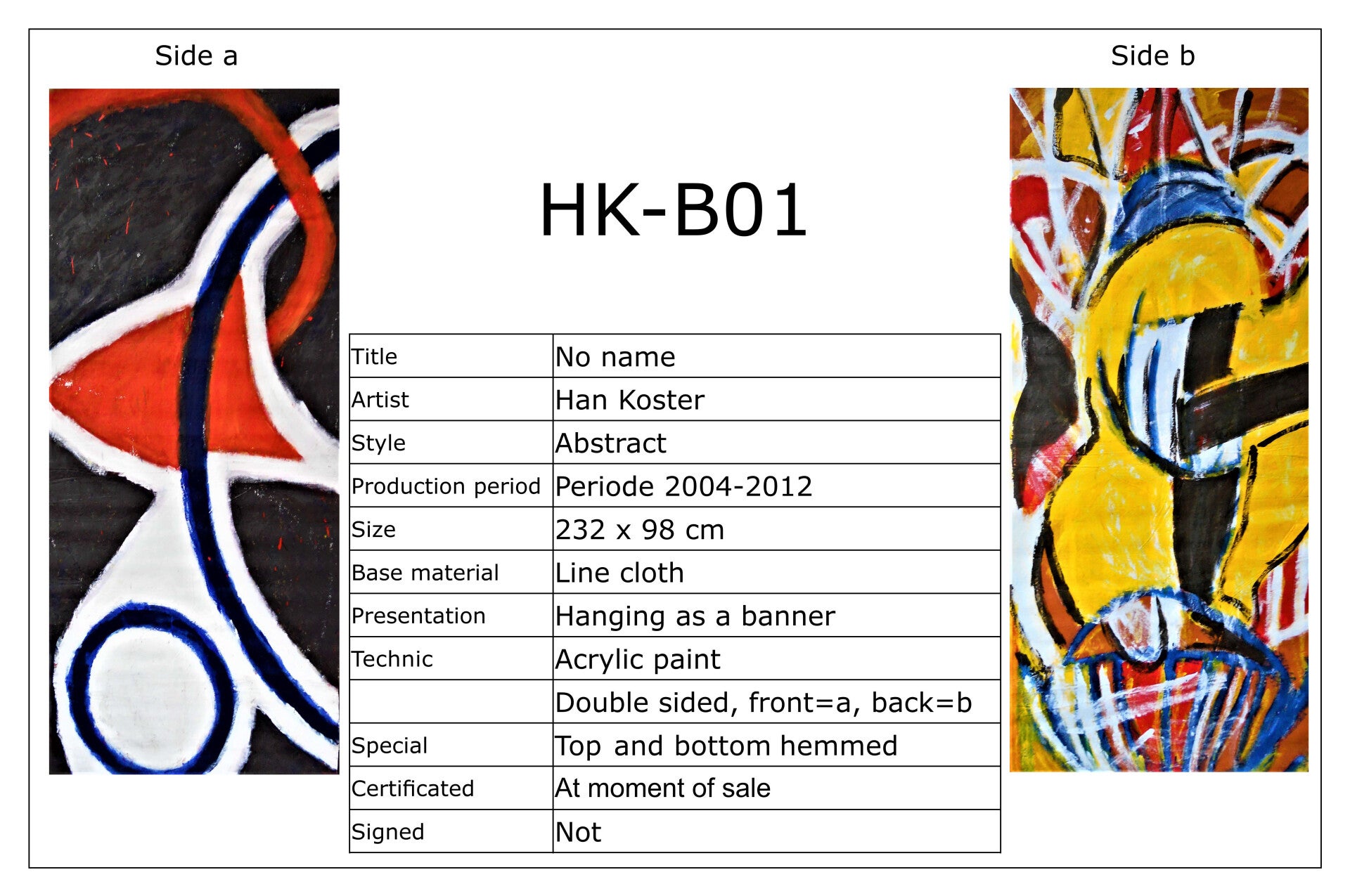 Banieren worden in principe tegen de wand gehangen. Meestal zijn ze 2-zijdig bewerkt. Dat betekent dat je maar 1 zijde tegelijk kunt zien. Vind je beide zijden interessant dan kun je ze af en toe omdraaien om ook van die andere zijde te genieten. Heeft u aankoop-interesse of wilt u meer informatie, neem dan gerust contact op. Een bod doen mag natuurlijk ook.